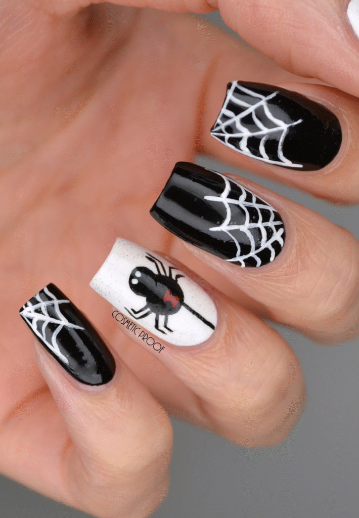 Spider web nails look cool, creepy, and elegant. Start with a black or dark purple base, then draw white or silver spider webs on top. If you want to make them sparkle, add a tiny gem or glitter near the web design.