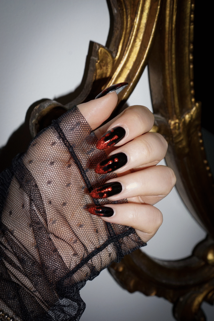 For a scary, vampire-inspired style, try blood drip nails. Use a nude or pale pink base, then paint red polish at the top and drag it downward to create a dripping blood effect. This bold and dramatic design is great for Halloween night.