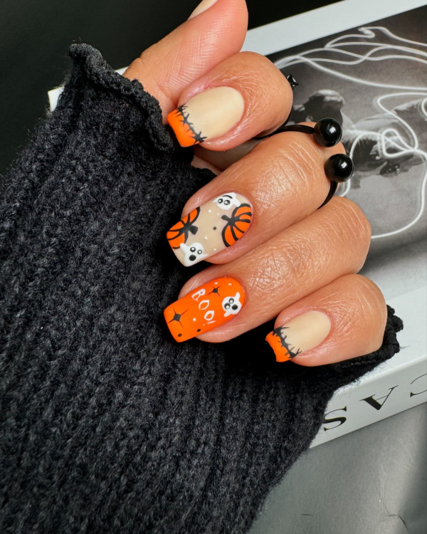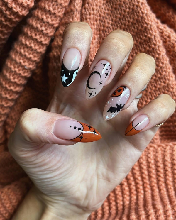 Black and orange are the traditional colors of Halloween. Paint your nails orange and add black tips, or create a mix of stripes, dots, and spooky patterns. This simple design never goes out of style and instantly gives off festive Halloween vibes.