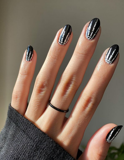 Skeleton nails look edgy and artistic. Paint your nails black and draw white bones or skulls using a thin nail brush. You can also paint just one accent nail with a skeleton design for a subtle yet spooky touch.