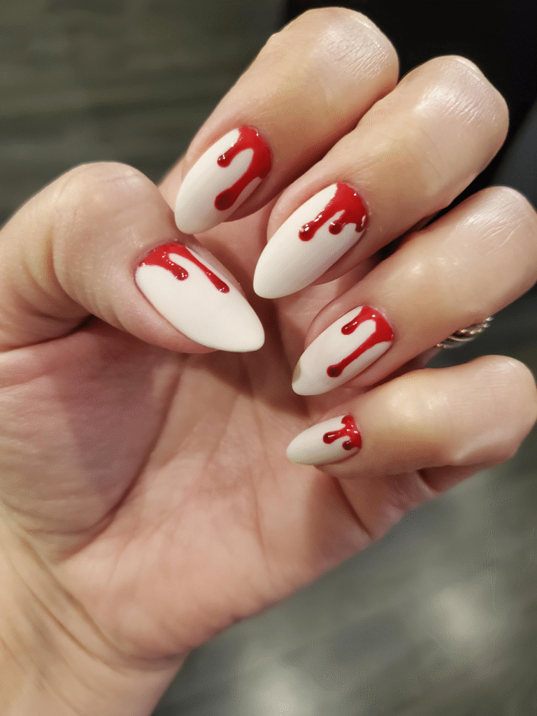 If you want something a little spooky, blood drip nails are a great choice. Paint your nails light or nude, then add red “drips” from the tips down—perfect for a vampire look!