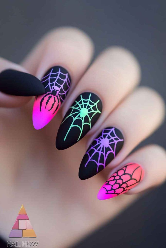 A black or dark purple base with white spider web designs looks cool and creepy. You can draw the webs with a thin nail brush or use stickers if you want an easy option.
