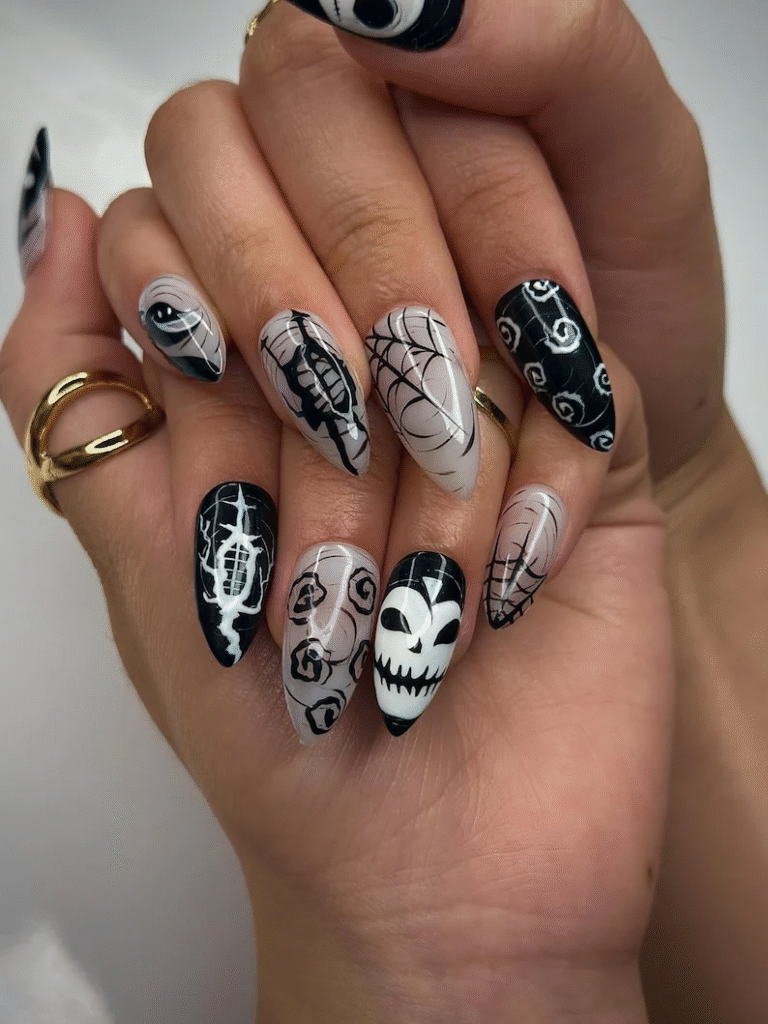 White bones or skulls on a black base can make your nails look spooky but stylish. It’s a simple design that always fits the Halloween theme.