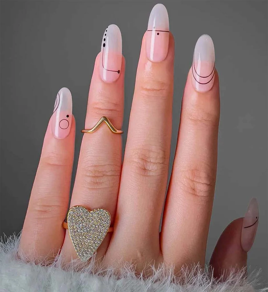 Create a small black curve near your nail base, forming a “half-moon” shape. Keep the rest of the nail nude and glossy. This minimal design adds a subtle artistic touch without being too bold. You can even mix it with a few accent nails featuring small dots or lines.