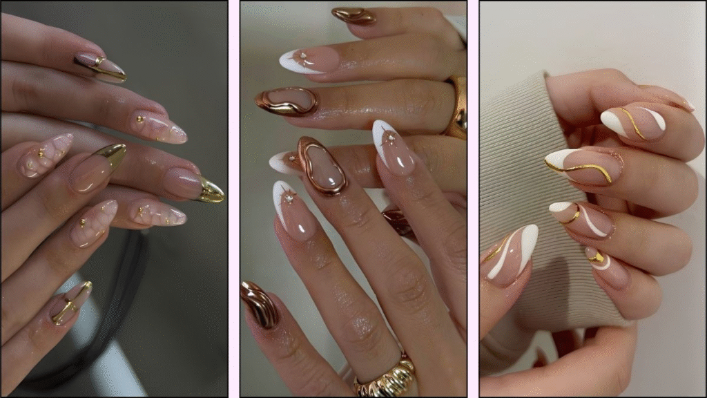 To make your nude and black nails more luxurious, add a hint of gold. After drawing black lines, place a small gold dot or thin gold stripe along the design. The gold details catch the light beautifully and give your nails a classy, high-end finish.