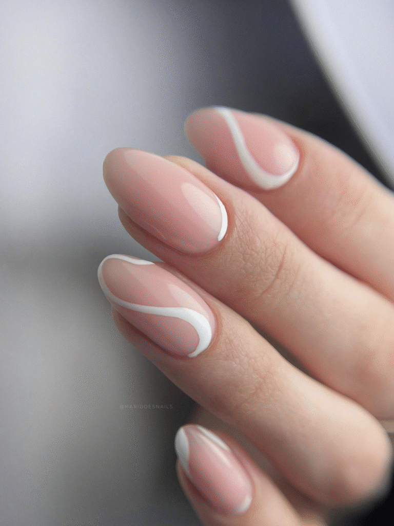 If you love an artistic and free look, abstract line nails are perfect for you. Use a nude polish as your base, then draw thin black lines in random curves or shapes. Each nail can have a different design, giving your hands a unique and creative feel. The best part is—there’s no need for perfection. The more natural the lines, the cooler they look!